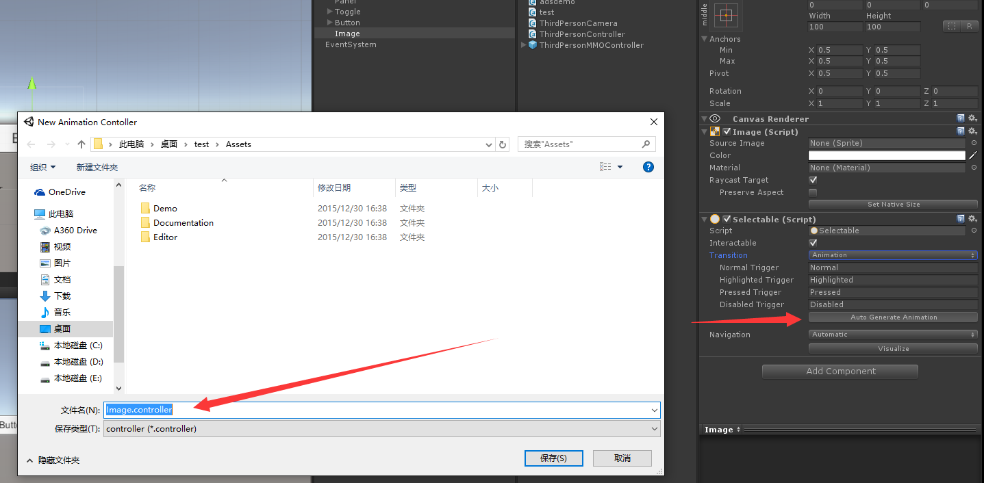 在Transition里动画功能就是Animation,这个动画比NGUI里的Tween更加厉害,各种动画效果什么的都可以随便搭配……下面侧重讲;当点击这个的时候会自动创建一个Animator controller,这个控制器还记得吧。没错就是状态机那个东东……(忘了的可以去面壁了)